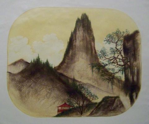 The painting offers a serene and picturesque landscape, characterized by a majestic mountain with its peak reaching into the sky, surrounded by rolling hills and lush greenery. A prominent tree extends its branches gracefully, and a small red-roofed structure, possibly a home or temple, adds an element of human presence to the natural wilderness. The sky is adorned with soft hues and gently floating clouds, creating a tranquil and harmonious atmosphere in the artwork.