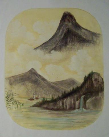 The painting portrays a serene landscape, where majestic mountains stand tall against a soft, yellowish sky. The peaks, shrouded in mist, cast their reflections upon the tranquil waters below, where a small sailing vessel adds a touch of life to the still scene. Rocky outcrops and sparse vegetation in the foreground offer a stark contrast to the smooth waters and cloudy skies, creating a harmonious blend of nature’s rugged beauty and peacefulness.