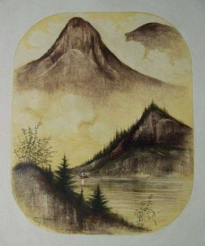 The painting captures a serene natural landscape, where the majesty of a towering mountain is the focal point. The mountain’s smooth and steep slopes rise gracefully, piercing the skies, while an adjacent smaller hill is adorned with lush greenery. A few trees stand tall, their silhouettes creating a stark contrast against the lighter background. The sky, depicted in soft hues, suggests either dawn or dusk, adding to the ethereal quality of the scene that exudes tranquility and the awe-inspiring beauty of untouched nature.