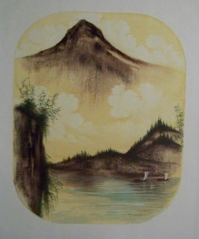 The painting presents a picturesque landscape framed within an oval, featuring a majestic mountain shrouded in a soft haze. Lush greenery and trees silhouette against the tranquil waters of a lake, reflecting the mountain’s splendor. A small boat with a solitary occupant floats gently, adding a sense of life to the peaceful tableau. The earthy tones of browns and greens, along with the blues of the water, create a harmonious color palette that evokes a profound sense of serenity.