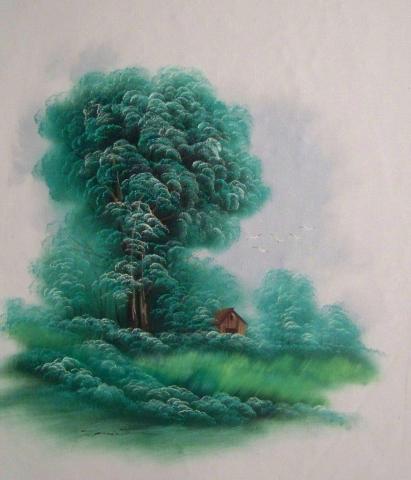 The painting captures a serene and peaceful landscape, predominantly featuring lush greenery. A large, dense tree with vibrant green leaves takes center stage, casting its shadow over the grassy terrain below. Nestled amidst the verdant surroundings is a small wooden cabin, adding a touch of rustic charm to the scene. The artist’s use of various shades of green and meticulous brushwork brings the foliage to life, evoking a sense of tranquility and connection with nature. The overall mood conveyed by this artwork is one of tranquility and peace, focusing solely on the beauty of nature.