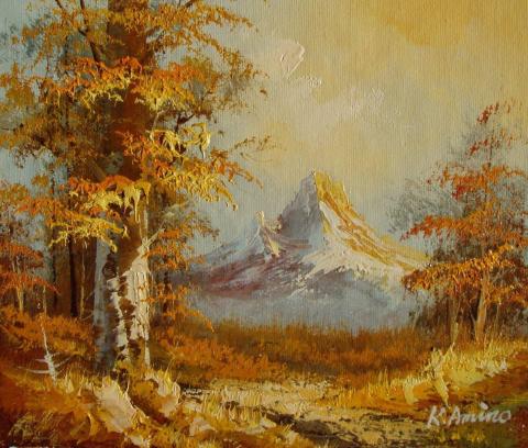 The painting is an impressionistic landscape that captures the warmth and beauty of a mountain scene. The foreground is adorned with trees, their leaves a vibrant mix of orange and yellow, suggesting the rich colors of autumn. In the background, the mountain rises majestically, its peak capped with snow, contrasting with the warm tones of the trees. The artist has signed the piece in the lower right corner, adding a personal touch to this picturesque canvas that invites viewers to revel in the splendor of the changing seasons.