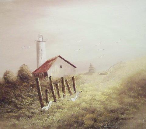 The painting portrays a tranquil scene with a lighthouse and keeper’s house set amidst lush greenery. The lighthouse stands out with its white structure and red roof, while birds add dynamism to the peaceful setting. A partially broken fence in the foreground, overgrown with vegetation, suggests the passage of time. The muted earthy tones and foggy backdrop create a calm, serene atmosphere, with an ethereal effect that enhances the painting’s rustic charm.