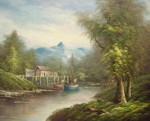 The painting depicts a serene and picturesque landscape where nature and human habitation coexist harmoniously. A calm river, reflecting the surrounding greenery and sky, flows gently through the scene. On its banks, lush green trees with dense foliage provide a stark contrast to the clear skies above. A quaint house with a sloping roof sits nestled among the trees, adding an element of human touch to this natural paradise. Anchored close to the shore are two boats with tall masts, their reflections dancing on the water’s surface. In the distance, majestic mountains stand tall against the sky, completing this idyllic setting.