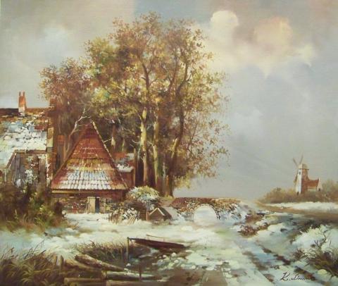 The painting portrays a charming rural winter scene, featuring a cozy cottage with a snow-dusted thatched roof, nestled beside tall trees and a stone bridge over a partially frozen stream. The landscape is touched by winter’s hand, with patches of snow enhancing the scene’s nostalgic atmosphere. In the background, a traditional windmill stands against a soft, cloudy sky, completing this picturesque depiction of tranquility and the timeless beauty of the countryside.