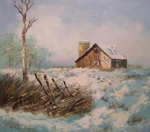 The painting is an impressionistic winter landscape, where a snow-covered field leads to a barn with a silo, set against a backdrop of bare trees. The loose brushwork and muted color palette of whites, blues, and greens evoke the chill of the season, while the barn’s brown hue adds a touch of warmth. The tree, with snow on its branches, and the fence in the foreground, frame the scene, inviting the viewer to appreciate the quiet beauty of a rural winter’s day. The painting’s style and colors capture the essence of winter’s stillness and simplicity.