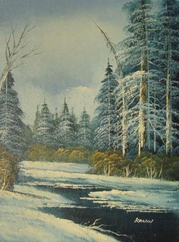 The painting is a winter scene, where a river cuts through a snowy landscape, its banks lined with trees burdened by snow. The sky above is a soft light blue, suggesting the calm after a snowfall. Signed in the bottom right corner, the painting is rendered in a realistic style, with a color palette dominated by blues, whites, and greens. The meticulous detail in the depiction of the snow-laden trees and the gently flowing river conveys a sense of quiet and the crispness of the winter air. The artwork invites the viewer to pause and appreciate the stillness and pristine beauty of the season.