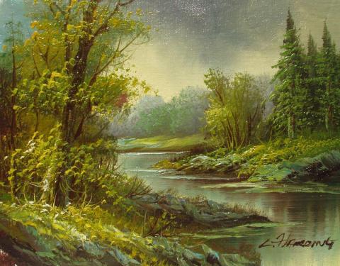 The painting is a serene depiction of a peaceful river scene, with the river taking center stage, flanked by lush trees and foliage. The colors are a soothing blend of green and yellow, with hints of blue reflecting in the water, creating a harmonious natural palette. The style is impressionistic, allowing the viewer to feel the tranquility of the setting through the artist’s loose brushstrokes. The light blue sky with white clouds adds a sense of depth and openness to the scene. Signed by L. Harding in the bottom right corner, the painting invites contemplation and a connection with the calmness of the natural world.