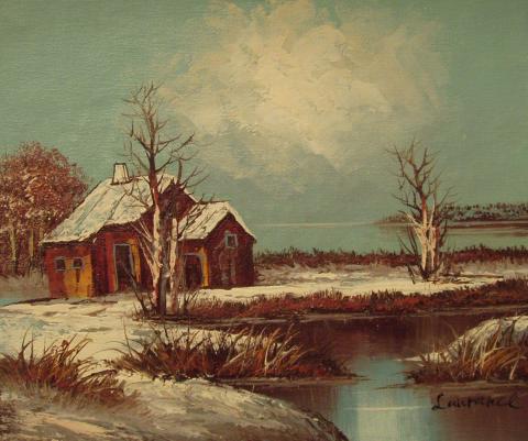 The painting is a charming depiction of a small cottage, its red walls and yellow door adding a pop of color to the snowy landscape that surrounds it. A river, reflecting the clear blue sky and white clouds above, flows gently in the foreground, while the background is adorned with trees, hinting at a secluded retreat in the midst of winter’s embrace. The artwork is a picturesque representation of a tranquil winter haven, inviting the viewer to imagine the warmth and comfort that lies within the cottage’s walls.