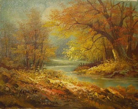 The painting is a depiction of an idyllic autumn scene, where a river gracefully winds through the center, flanked by trees with orange and yellow leaves on the left and bare branches on the right. The hazy gray sky and the light blue river create a tranquil atmosphere, while the warm colors of the foliage evoke the essence of fall. The impressionistic style of the painting adds a softness to the scene, inviting viewers to experience the peacefulness of the season.