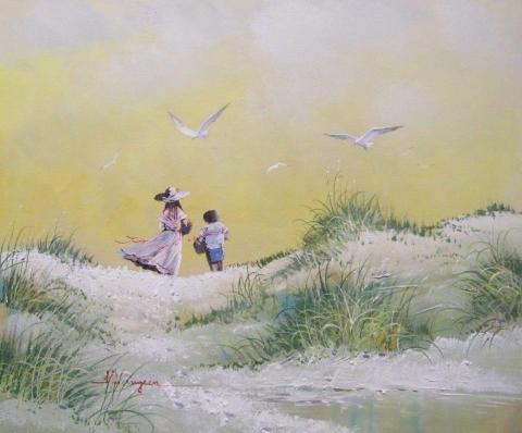 The painting portrays a tender moment between a mother and child as they stroll along a beach, with the soft pastel hues of the sky and sand creating a backdrop of tranquility. Seagulls soar above, adding a sense of freedom to the scene, while the mother, clad in a flowing white dress and wide-brimmed hat, gently holds the hand of her child, dressed in blue. The peaceful mood is palpable, as the duo’s leisurely walk is framed by the natural beauty of the sand dunes and the calm waters beyond.