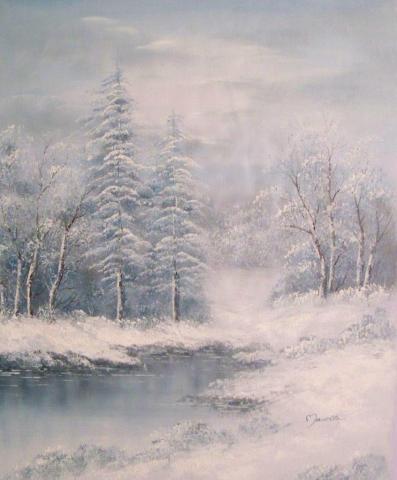 The painting is a winter landscape of a snowy forest with a river flowing through it. The trees, blanketed in snow, stand against a light blue sky dotted with clouds, creating a peaceful and serene mood. The artist’s signature in the bottom right corner adds a personal touch to the scene. The use of soft colors and the gentle movement of the river contribute to the tranquil atmosphere, inviting the viewer to experience the quiet beauty of a winter’s day. The painting’s style and composition evoke a sense of harmony with nature during the cold season.