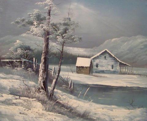 This painting depicts a cozy wooden cabin nestled in a snowy landscape, surrounded by bare trees and a frozen pond. The snow-covered roof and ground contrast with the warm brown tones of the cabin’s walls and windows. The grey sky and distant mountains create a sense of depth and perspective, while also conveying the cold and quiet atmosphere of winter. The painting evokes a feeling of calmness and solitude, as if the cabin is a refuge from the harshness of nature.