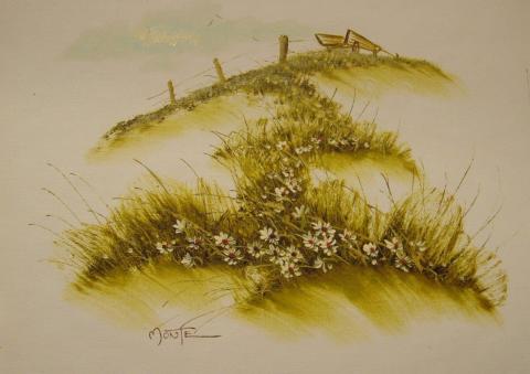 This painting depicts a tranquil scene of a grassy path leading to a wooden fence and gate. The path is sprinkled with white flowers that contrast with the green grasses. The sky is lightly painted with hints of blue and white clouds, creating a peaceful atmosphere. The artist’s signature can be seen in the bottom left corner.
