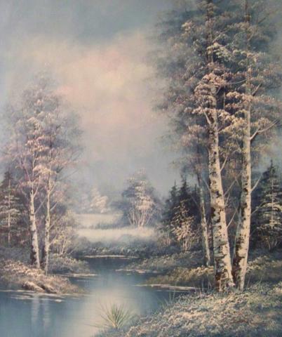 The painting portrays a quintessential winter landscape, where a river, flanked by snow-laden trees, carves its way through the scene. The trees, cloaked in a blanket of snow, stand in stark contrast to the pale blue sky, which casts a serene glow over the entire setting. The mood is one of peacefulness and serenity, as the realistic style of the painting invites the viewer to step into this tranquil world and experience the stillness of a winter’s day. The use of predominantly blue and white hues enhances the cold, crisp atmosphere, capturing the essence of the season with a gentle, artistic touch.