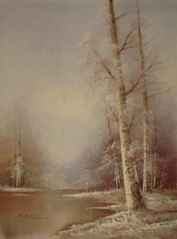 The painting portrays a tranquil winter landscape, where bare trees dusted with snow stand against a muted backdrop, and a still body of water adds to the scene’s peacefulness. The soft hues and tones convey a quiet solitude and introspection, with the artist’s signature at the bottom left corner, hinting at the creator’s presence in this silent, expressive tableau.