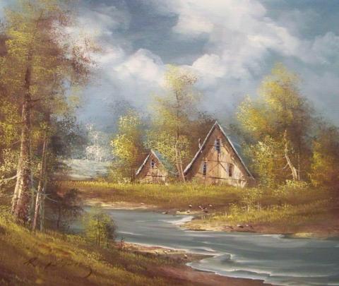 The painting depicts a peaceful rural landscape. There are three A-frame cabins situated near each other surrounded by trees. A calm river flows in front of the cabins. The sky is filled with soft clouds allowing some light to pass through. There’s an abundance of greenery indicating it might be spring or summer season. The overall mood conveyed by the painting is one of tranquility and peace.