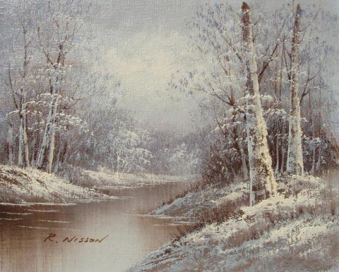 The painting is a serene winter landscape, capturing the quiet beauty of nature blanketed in snow. Dominated by a palette of cool blues and whites, it features a gently meandering river that draws the eye through the center of the canvas. Snow-covered trees line the banks, their branches heavy with the weight of winter. The sky above is a soft, light blue, suggesting the calm of a cold winter’s day. This realistic portrayal of a winter scene is signed by the artist, R. Nisson, whose attention to detail brings the chilly tranquility of the season to life.