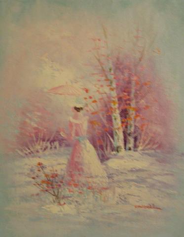 This painting captures a serene and ethereal scene, where a woman, abstractly represented, stands amidst a tranquil and dreamlike landscape. The soft pastel hues of lavender, pink, and white blend seamlessly to create an atmosphere of peace and quietude. The lady is adorned in a long dress that flows gracefully, merging with the surrounding nature. Trees with delicate branches and leaves are depicted in gentle strokes of paint, adding to the overall mystique of the artwork.