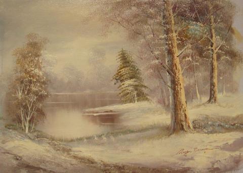 The painting is a depiction of a winter landscape, characterized by a realistic style and a muted color palette that conveys a peaceful mood. It features a frozen lake set against a backdrop of snow-covered trees, with a path leading towards the lake, inviting the viewer into the scene. The artist has signed the painting in the bottom right corner, adding a personal touch to this tranquil portrayal of the season’s quiet beauty. The overall effect is one of calm and stillness, capturing the essence of winter’s serene atmosphere.