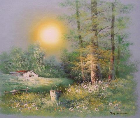 This painting depicts a serene and peaceful natural landscape bathed in the soft glow of sunlight. A small, rustic cabin is nestled amidst lush greenery, surrounded by tall, slender trees that reach towards the sky. In the foreground, a wooden boat and a metal bucket are set amongst wildflowers, suggesting a quiet moment of solitude or reflection. The artist uses gentle brush strokes and a muted palette to evoke a sense of tranquility and harmony with nature.