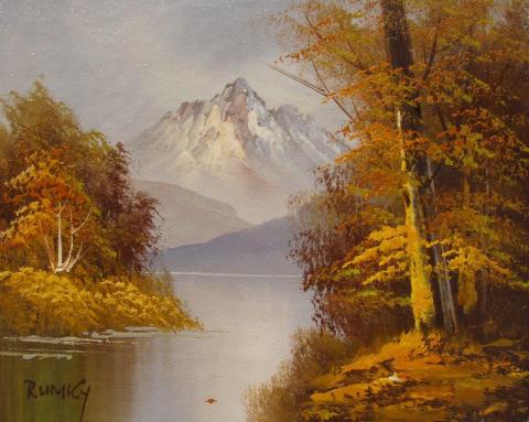 The painting is a captivating depiction of a mountain landscape, with a lake in the foreground that mirrors the tranquility of the scene. The warm colors used throughout the painting create a peaceful mood, inviting the viewer to a moment of reflection. The mountain, snow-capped and majestic, stands tall in the background, while the lake’s calm waters and the autumnal trees on the right, with their shades of orange and yellow, add to the painting’s serene atmosphere. Signed in the bottom left corner, this artwork is a testament to the beauty of nature and the artist’s ability to capture it on canvas.