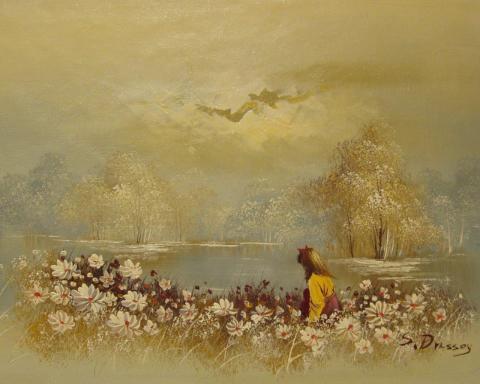 The painting is a tranquil depiction of nature, with a figure in yellow sitting among white flowers near a calm lake. The trees in the background have varied colors of leaves, and the sky is softly painted with light and dark tones. Birds are flying in the sky, adding a sense of movement and life to the scene. The painting has a signature at the bottom right corner.