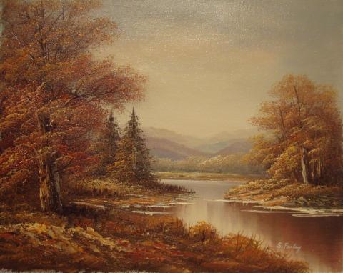 The painting is a depiction of an autumn landscape with a river flowing gently through the scene, flanked by trees in vibrant orange and brown hues. The warm colors and serene mood of the painting suggest a tranquil, crisp autumn day. In the background, a mountain range adds depth to the composition, while the falling leaves and peaceful river invite the viewer to pause and reflect on the beauty of the changing seasons. The artist’s use of color and composition creates a harmonious and inviting natural setting.