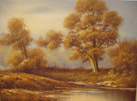 The painting is a warm and inviting landscape featuring a tall tree on the right and a body of water on the left. The warm colors of the scene, along with the still water that reflects the tree and sky, create a peaceful mood. The light blue sky with white clouds adds a sense of calmness, while the background is filled with more trees and bushes, contributing to the overall serene atmosphere of the painting.