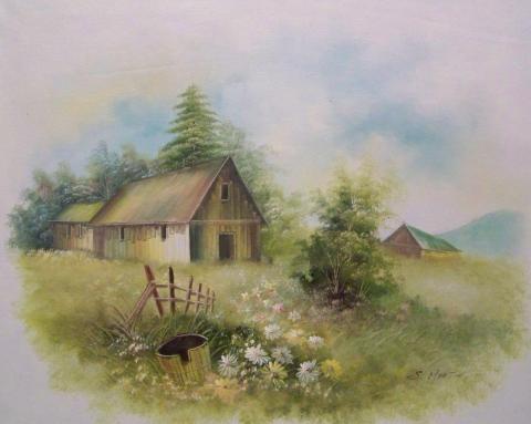 This painting captures a serene rural landscape, where an old wooden barn with a rusted roof stands amidst lush greenery. A broken wheelbarrow lies abandoned in the foreground, surrounded by wildflowers that dot the overgrown grass. In the distance, another similar structure is partially obscured by trees and foliage. The sky above is painted with soft hues of blue and white, suggesting a calm, sunny day. The entire scene exudes an air of peaceful neglect, where nature has begun to reclaim its space.