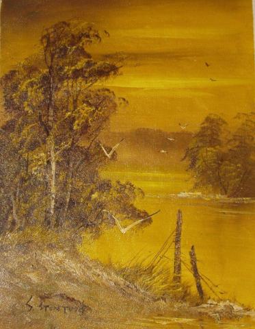 The painting depicts a serene landscape dominated by a lake on the right and trees on the left, all rendered in a warm yellow and brown color palette. The impressionistic style of the artwork captures the tranquility of nature, with birds gracefully soaring in the sky above and a rustic fence in the foreground, adding depth and perspective to the scene. The overall effect is one of peacefulness and harmony, inviting the viewer to contemplate the beauty of the natural world.