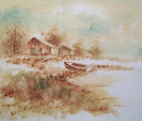 The painting is a depiction of a small wooden cabin and a boat on the shore of a lake. The painting is done in a soft, impressionistic style with a muted color palette. The cabin is small and has a sloping roof. It is surrounded by trees and bushes. The boat is a small rowboat and is resting on the shore. The lake is calm and the sky is a pale blue with wispy clouds. The painting is signed by the artist “T. Travis” in the lower right corner. The painting may be inspired by the Canadian landscape or the French impressionism.