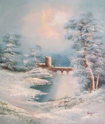 The painting is a winter landscape featuring a snow-covered bridge over a river, with trees on either side. The sky is painted in a soft orange, adding a warm glow to the cold scene. The trees are heavily laden with snow, and the bridge, made of stone with three arches, creates a picturesque focal point. The river, a deep blue and partially frozen, contrasts beautifully with the surrounding snow. Signed in the bottom right corner, the painting evokes a peaceful and serene mood, capturing the quiet beauty of a winter’s day.