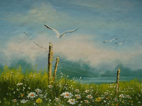 This painting is a tranquil depiction of a countryside scene with a blue sky, green grass, and white daisies. The painting is done in an impressionistic style, using loose brushstrokes and soft colors. The painting conveys a sense of calmness and joy, as the birds fly in the sky and the fence post stands in the foreground. The painting also shows some depth and perspective, as the grass and the sky fade into the distance. The painting is signed by the artist in the lower right corner. The painting is a delightful example of how art can portray the beauty and simplicity of nature.