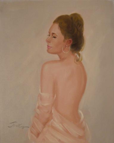 The painting depicts a figure from behind, dressed in a white dress with a low back, suggesting a sense of elegance and simplicity. The person’s hair is neatly arranged in a bun, adding to the poised appearance. The light peach background provides a soft, warm ambiance that complements the subject’s attire. A signature in the bottom right corner indicates the artist’s mark, completing this serene and thoughtful composition.
