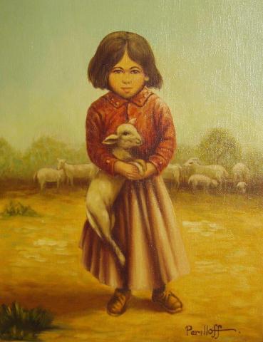 This painting is a portrait of a young girl in a red dress holding a lamb in a pastoral setting. The artist used oil on canvas to create a realistic and detailed image of the girl and the lamb, as well as the field and the sheep in the background. The painting has a warm and gentle tone, as the girl and the lamb seem to share a bond of affection and innocence. The painting is similar to the style of [Norman Rockwell], a famous American illustrator who was renowned for his paintings of everyday life and scenes of rural America.