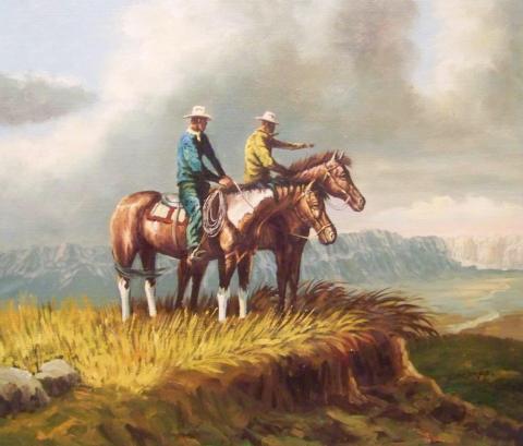 This painting is a realistic depiction of two cowboys on horseback in a mountainous landscape. The cowboys are wearing traditional cowboy hats and clothing, showing their culture and profession. The horses are brown and are wearing saddles, indicating that they are trained and loyal companions. The background is a mountain range with a cloudy sky, creating a sense of space and depth. The painting is done in a realistic style with attention to detail, capturing the texture and shape of the cowboys, the horses, and the mountains. The painting portrays the cowboys’ lifestyle and personality, as well as the beauty and challenge of the natural scenery.