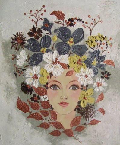 The painting depicts a woman surrounded by an array of beautifully painted flowers. The flowers are rendered in various colors, including yellow, white, and dark hues, creating a visually striking contrast against the grey background. The leaves and stems are intricately detailed, adding to the overall aesthetic appeal of the artwork.