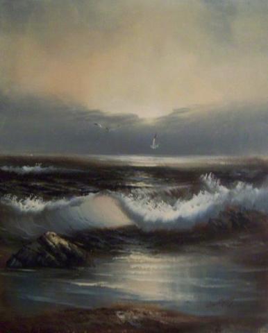 The painting shows a stormy sea, with dark clouds and lightning bolts filling the sky. The waves are white and frothy, crashing against the shore and creating a large splash in the center of the painting. The colors are mostly dark and muted, with the exception of the white foam on the waves and the light in the sky. There are a few birds flying in the sky and a sailboat in the distance. The painting is done in an impressionistic style, with loose brushstrokes and blurred details. The artist’s signature can be seen in the lower right corner. The painting conveys a sense of awe and danger, as well as the beauty and power of nature.
