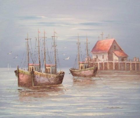 This is a painting of three boats docked at a pier with a small building in the background. The painting is done in a realistic style with a muted color palette. The boats are wooden with tall masts and are painted with fine details. The pier and the building suggest a fishing village or a port. The calm sea and the cloudy sky create a peaceful and serene atmosphere. The painting conveys a sense of nostalgia and simplicity.