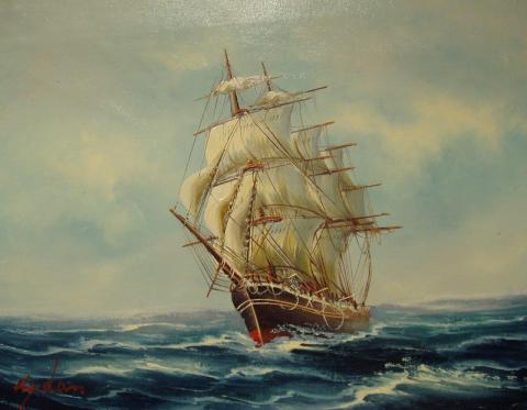 The painting captures a majestic sailing ship with multiple masts and billowing sails, navigating tumultuous ocean waves. The sky is a mix of ominous clouds and breaks of serene blue, suggesting a storm has just passed or is approaching. The ship, detailed with intricate rigging and a robust hull, stands as the focal point against the dramatic natural backdrop. It evokes a sense of adventure and the timeless struggle between man and nature.