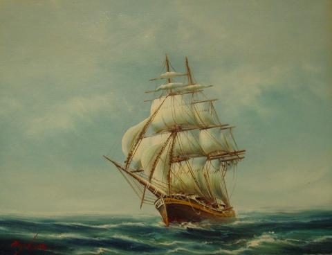 The painting captures a majestic sailing ship with multiple masts and billowing sails, navigating through tumultuous ocean waves. The sky is painted with soft hues, suggesting either dawn or dusk, casting a serene yet dramatic atmosphere. The ship’s intricate details and the dynamic movement of the waves are depicted with skilled brushwork,