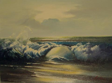 This painting captures a dramatic seascape scene, where powerful waves crash onto the shore under a vast sky. The artist has skillfully used a mix of dark and light hues to depict the tumultuous sea, with white foam crowning the tops of the waves, contrasting against the deeper blues and greens of the ocean. The sky is painted with lighter tones, suggesting either a sunrise or sunset horizon where it meets the sea in the distance. The overall mood conveyed is one of nature’s powerful beauty and majesty.