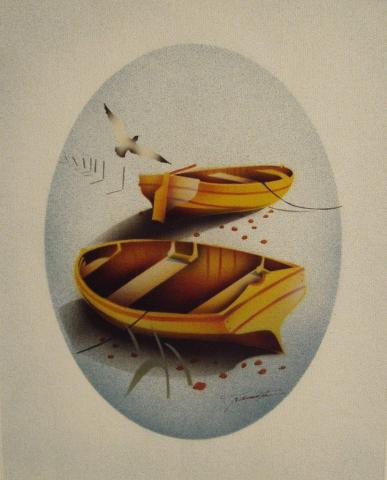 The painting depicts a tranquil scene of two boats resting on the calm water of a lake or a river. The boats are wooden. The water reflects the blue sky and the green trees that line the shore. A white bird, possibly a swan or a goose, is swimming near the boats, adding a touch of life and movement to the otherwise still picture. The painting has a realistic style and uses soft and bright colors to create a peaceful and serene mood.