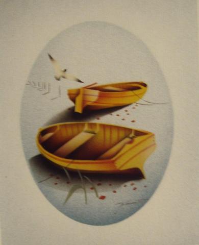 The painting depicts a tranquil scene of two boats resting on the calm water of a lake or a river. The boats are wooden. The water reflects the blue sky and the green trees that line the shore. A white bird, possibly a swan or a goose, is swimming near the boats, adding a touch of life and movement to the otherwise still picture. The painting has a realistic style and uses soft and bright colors to create a peaceful and serene mood.