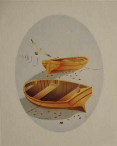 The painting depicts a tranquil scene of two boats resting on the calm water of a lake or a river. The boats are wooden. The water reflects the blue sky and the green trees that line the shore. A white bird, possibly a swan or a goose, is swimming near the boats, adding a touch of life and movement to the otherwise still picture. The painting has a realistic style and uses soft and bright colors to create a peaceful and serene mood.
