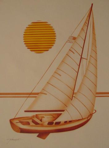 Sailing in the Sunset: This painting depicts a serene scene of a sailboat gliding on calm waters under the golden sun. The boat, with its sails fully extended, captures the essence of peaceful solitude. The artist uses warm tones to create a sense of harmony and tranquility. The simplicity of the composition, combined with the meticulous detailing of the boat and sails, evokes a sense of elegance and grace.