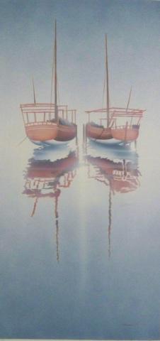 Reflections of Serenity: This painting captures two boats, seemingly floating amidst a serene and tranquil environment. The boats are depicted in a minimalist style, with their reflections creating an almost symmetrical visual effect. The use of soft, muted colors contributes to the overall calm and peaceful atmosphere of the artwork. The water’s surface is not clearly defined, blurring the lines between reality and reflection and adding a dreamlike quality to the painting.