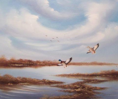 This is a painting of a landscape with a lake and two birds flying over it. The painting has a realistic style with soft brushstrokes. The sky is blue with white clouds and the lake is surrounded by brown and green vegetation. The birds are white and black and are flying towards the right side of the painting. The painting has a serene and relaxing quality to it.