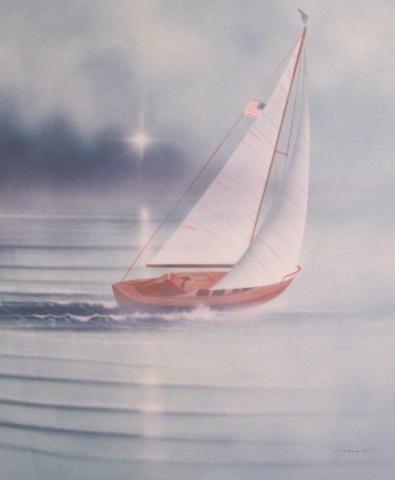 This is a painting of a sailboat on a body of water. The sailboat is in the foreground and the background is a misty landscape. The colors are soft and the mood is peaceful. The sailboat is a pinkish color with a white sail. The water is a light blue color with ripples. The background is a misty landscape with trees and a horizon line. The painting is done in a soft, impressionistic style.